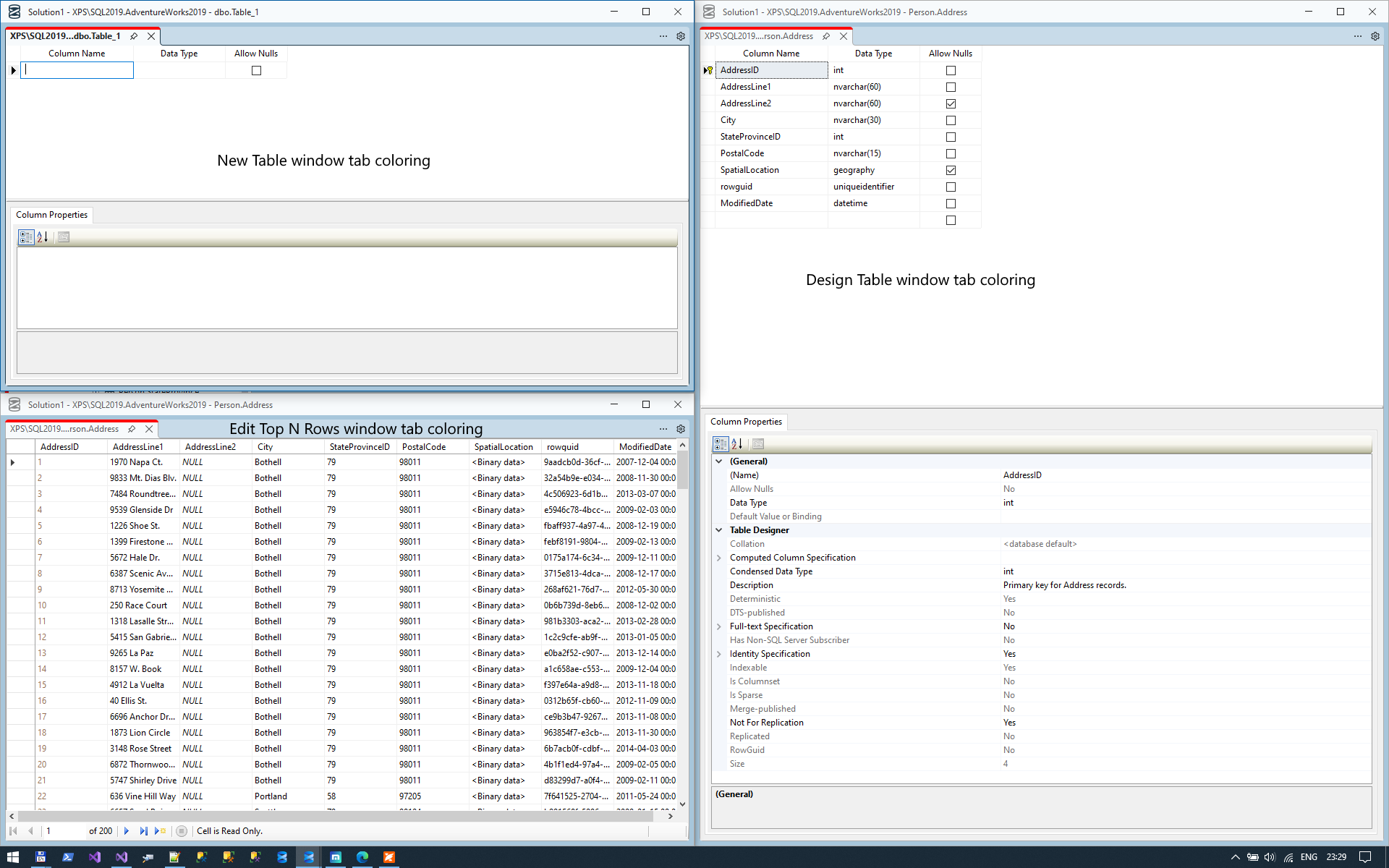 Version 7.0.0.0 adds coloring of the tab bar for Edit Top N Rows, Table Designer and New Table windows for SSMS 21 and 22 only.
